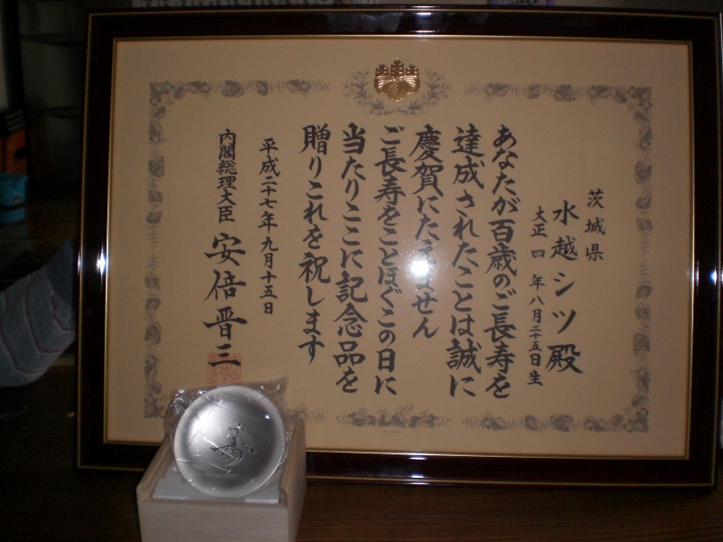 私事なのですが、年寄りおばちゃんが百歳になり、国や県、市から賞状を頂きました。とても嬉しいことです。孫も8月に産まれ、おばちゃん、親夫婦、私達夫婦、子供達、そして孫と今は親子5世帯になりました。